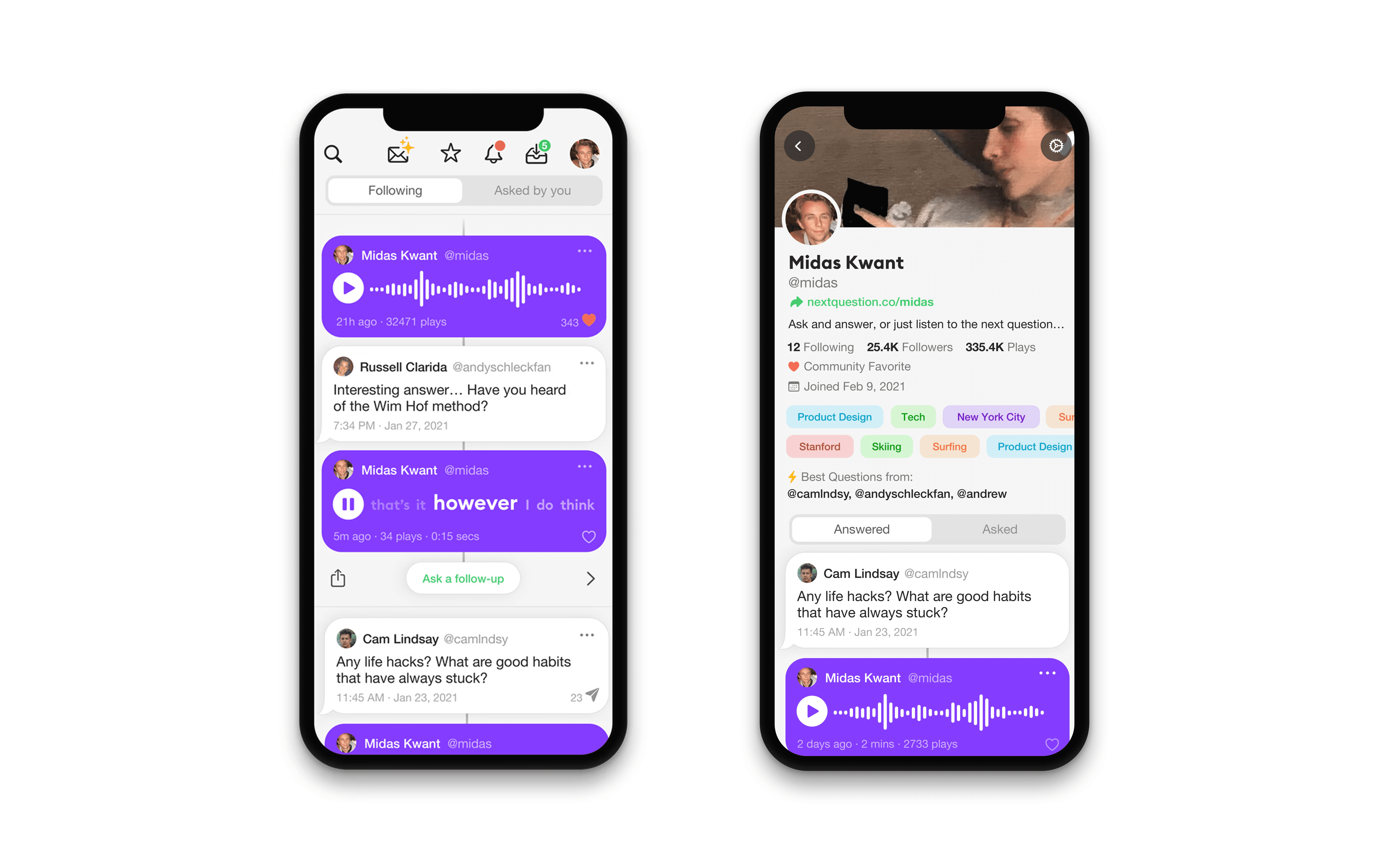 NextQuestion was a social Q&A app where users have public profiles and receive text questions which they can answer with voice recorded answers.