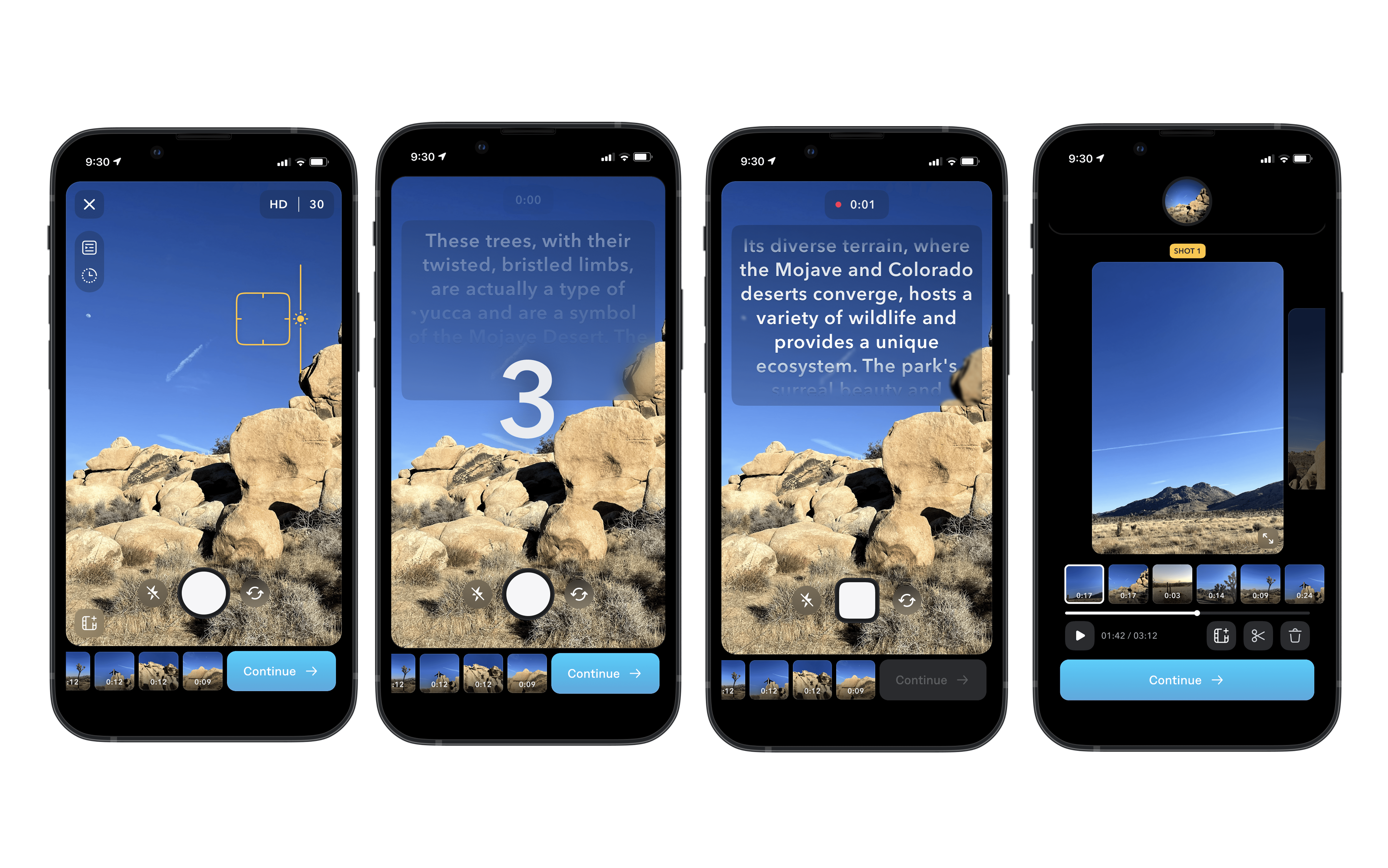 End-to-end redesign of the camera and its functionalities from scratch. The focus was on the teleprompter and clip management UX (easy access to redo takes and sort clips for short-form talking-head videos).
