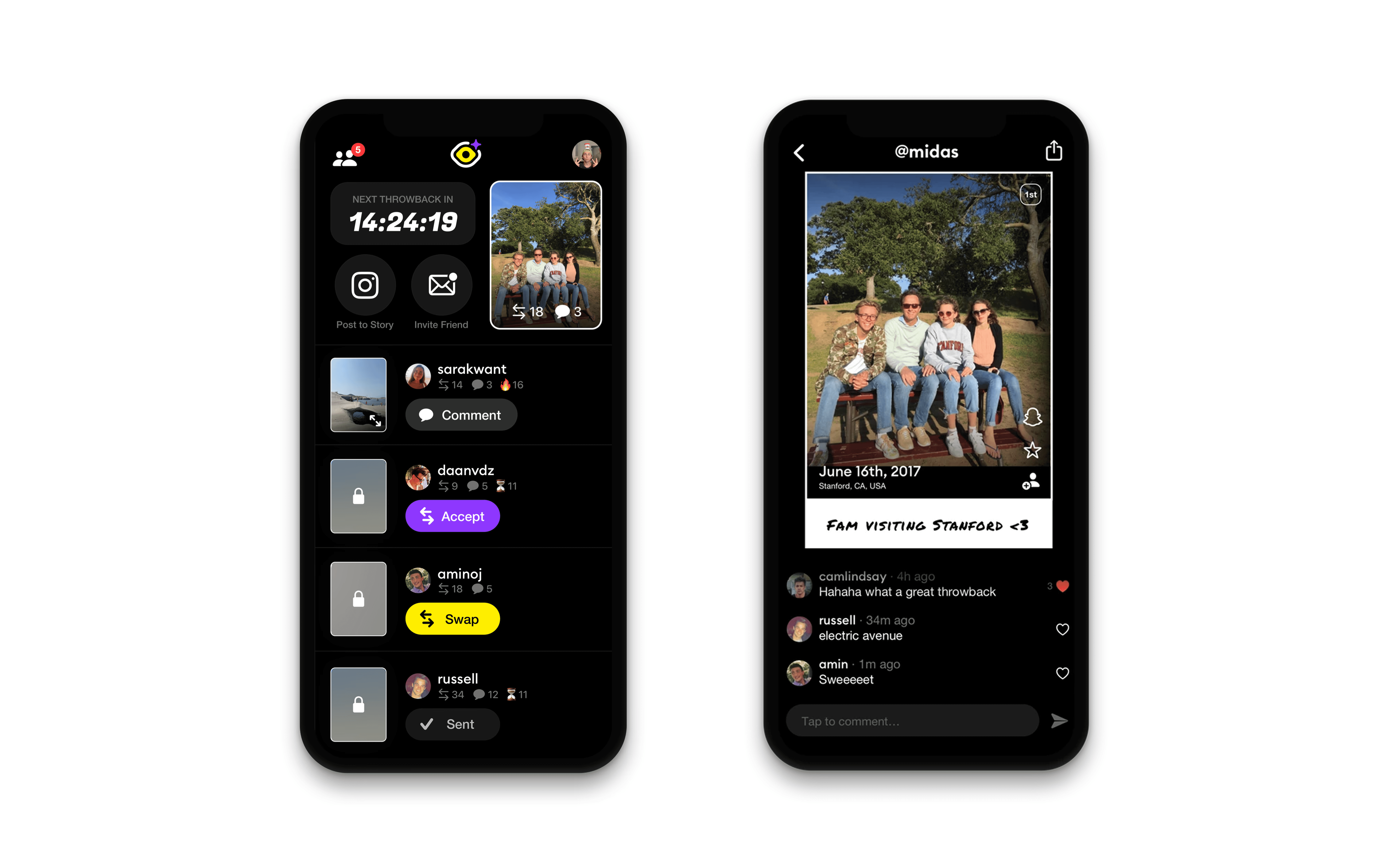This ended up feeling gamified and perfect for a consumer social product. Since we were now in the business of throwbacks and memories, it felt suitable to design and habituate users around a daily habit of swapping. Giving folks a daily notification when their throwback was ready. A simple ritual that’s driven by anticipation and positive-surprise.